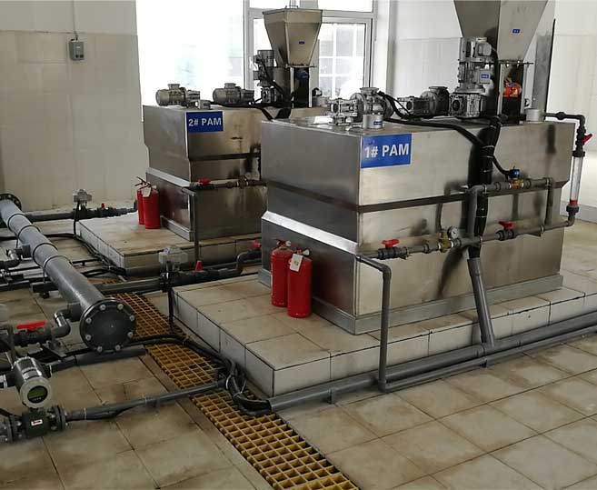 PAM dosing device is used for dosing polyacrylamide flocculant in sludge dewatering machine room. PAM can be divided into anionic, cationic, nonionic and complex ionic. The powder is a white or slightly yellow powder with a molecular weight between 4 million and 18 million. It is soluble in water, but the dissolution rate is very slow, and it is easy to decompose when the temperature exceeds 120 °C; its aqueous solution is a colorless viscous colloidal transparent liquid, without Poisonous, non-corrosive, soluble in water. Products of different varieties and molecular weights have different properties. Sludge dewatering mainly chooses cationic PAM.